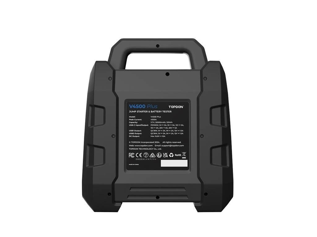 Jump startér TOPDON V4500 Plus oferuje doskonałe rozwiązanie zasilania dla pojazdów o dużej pojemności, takich jak naczepy i przyczepy. Z szczytowym prądem 4500 A jest specjalnie zaprojektowany dla samochodów o napięciu 12 V i nadaje się dla pojazdów benzynowych i wysokoprężnych z silnikami do 16 litrów.