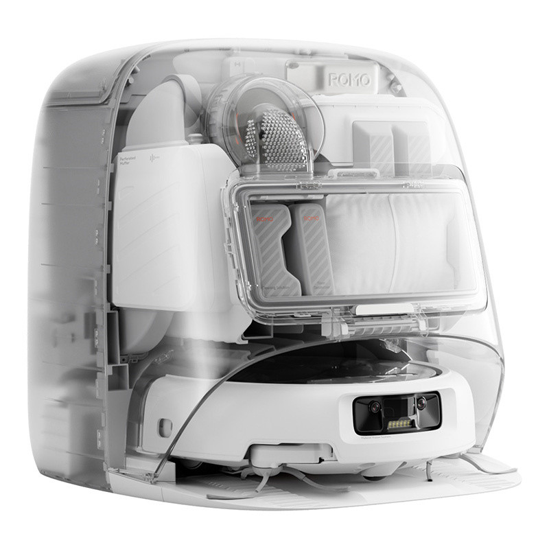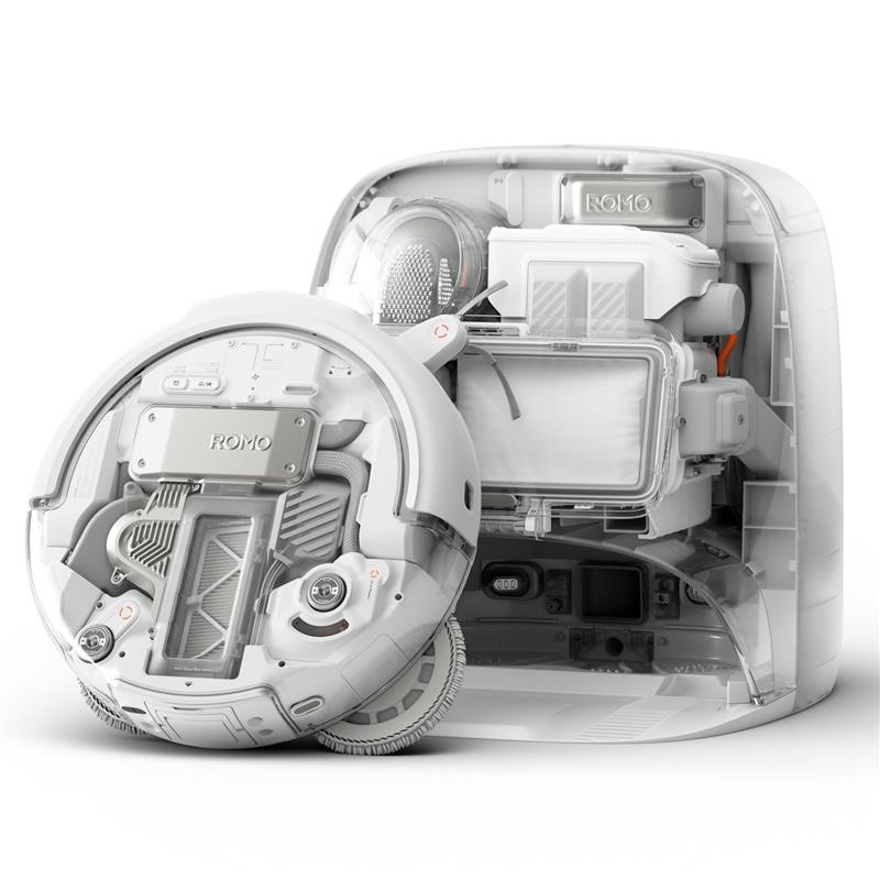 DJI ROMO P i jego stacja wyróżniają się eleganckim designem – przezroczyste elementy obudowy pozwalają zajrzeć do środka i zobaczyć technologię w akcji. Urządzenie jest nie tylko funkcjonalne, ale również estetyczne – świetnie wpisze się w każdy nowoczesny dom.